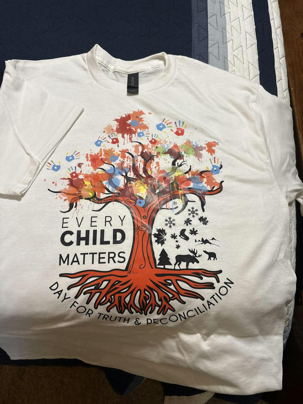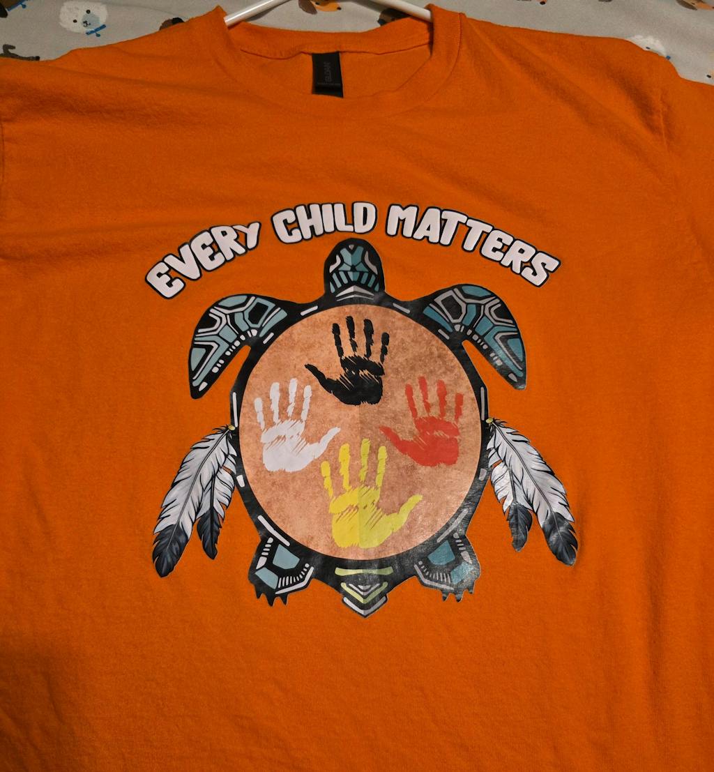 Great quality Gildan brand t shirt. Turtle with 4 hands - Every Child Matters design. Great shirt! Hopefully the colorful design will last a while. The decal sticker placed on shirt is very plastic like - not sure it will hold up very well to washing. I've had similar material on tshirts that the decal quickly cracks and peels which makes the shirt look old and worn out. It has survived 2 washings so far with no issues.