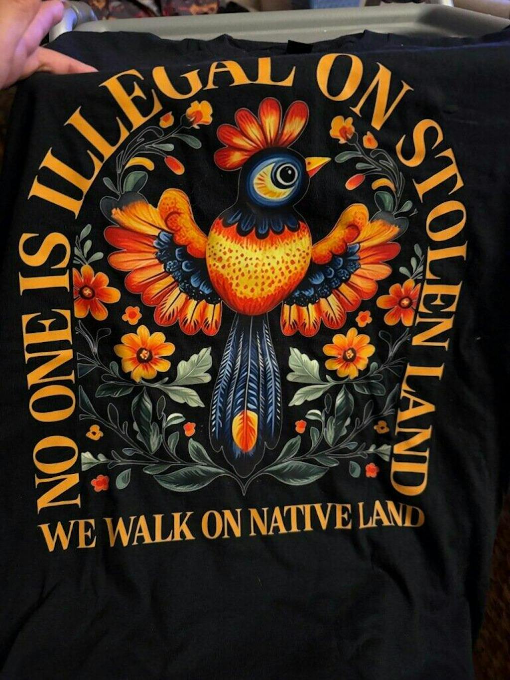 I'm very happy with everything about the shirts I purchased. The.price, quality, delivery time, and ofcourse the message. "No One Is Illegal On Stolen Land". I bought them for my sisters for Christmas, we stand in solidarity and wear this message with PRIDE.